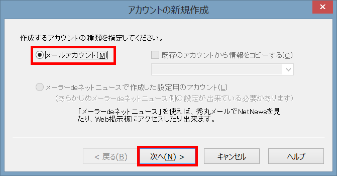 - 「メールアカウント」を選択して「次へ」をクリックします。