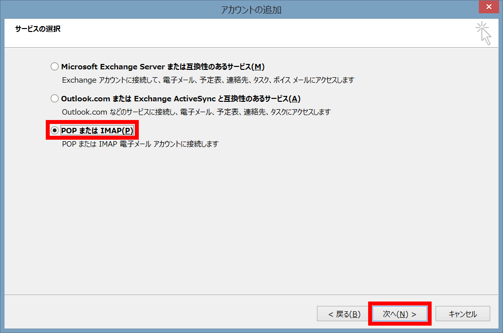 - 「POPまたはIMAP」を選択して「次へ」をクリックします。