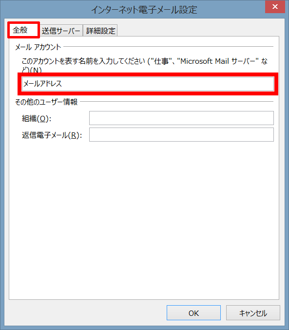 - 「このアカウントを表す名前を入力してください」に、設定を行ったメールアドレスの設定名を、必要があれば変更します。「送信サーバー」タブをクリックします。