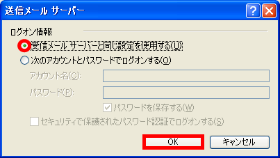 - 「受信メールサーバーと同じ設定を使用する」を選択して「OK」ボタンをクリックします。