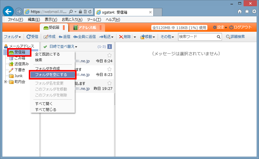 空にするフォルダを選択し、「右クリック」し、「フォルダを空にする」をクリックします。ここでは受信箱を選択しています。