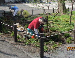 令和4年3月20日(日)…昨夜の雨もあがり、春の日差しのなか、毎年継承しているヒガンバナの株分けを中心に活動しました。新しい方を含め13名が参加しました。ラッパスイセン、クリスマスローズ、ユキヤナギがきれいです。また、保全・補植しているカタクリが咲き出し、キツネノカミソリ、カンゾウの若芽が春の訪れを告げています。
