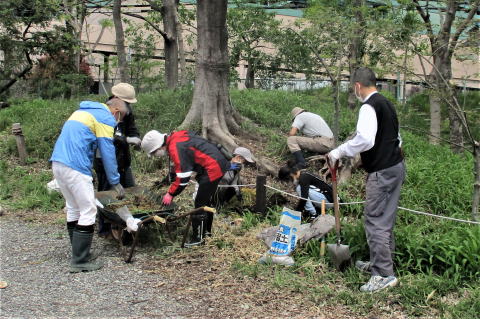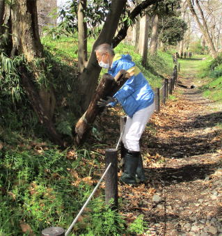令和3年.3月28日(日)、先週は雨でこの日に順延し全体活動をしました。マスク着用、消毒を徹底し、高校生、小学生、幼児を含む20名が参加しました。3/15より着手していた全域の杭とロープの交換が完了しとてもきれいになりました。