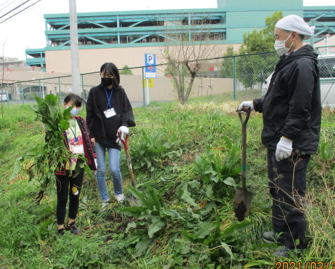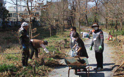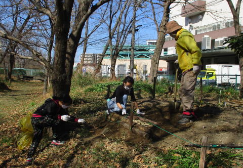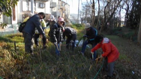 清掃など緑地内の整備時には出入りが不便だったので、西側2ケ所のロープの1部を開け、出入り口をつくりました。また、東側では、ハルジオン、セイヨウカラシナ、セイヨウタンポポの三種を取り除きました。これらの外来種除去はこれからも継続していきます。メンバーの男性は、手づくりしたお汁粉30人分をナベに入れて差し入れてくれました。