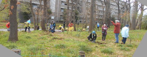 令和2年(2020年)11月初旬、府中駅の横の植栽にあった「ウマノスズクサ」を掘り出し、当緑地の東側、松の苗あたりに移植しました。ウマノスズクサは希少種ジャコウアゲハ蝶幼虫の食草で、当会でも保全と増殖をしています。