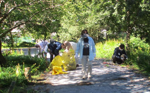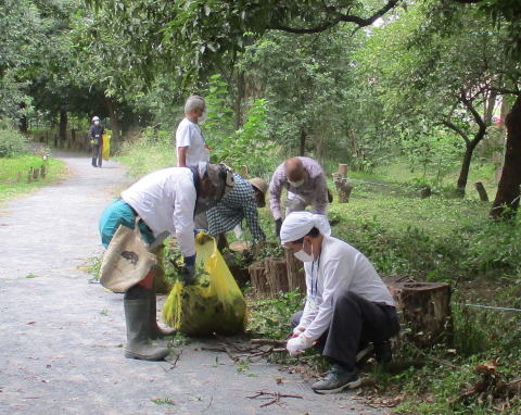 令和2年(2020年)9月20日(日)、全体のごみ拾いと置いてあった木の枝や草を回収しました。また、春に東側入り口近くに植えたヤマハギをロープや棒で固定しました。小中学生を含む17名が参加しました。