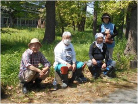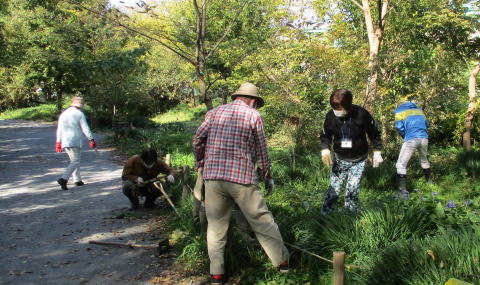 花や草木の色どりが映えるなか、5月連休の前半は快晴に恵まれ、朝早くからたくさんの人が散策しています。通行しやすく、すこしでも快適になるよう、有志が刈払機あるいは手で主経路の除草、草抜きをしました。