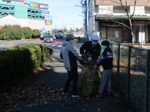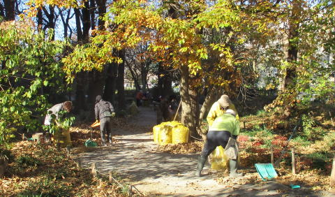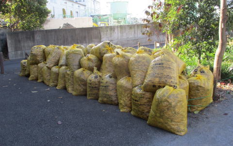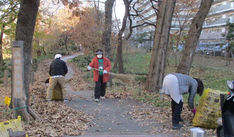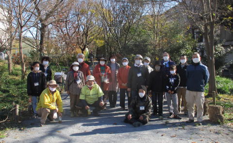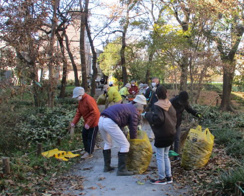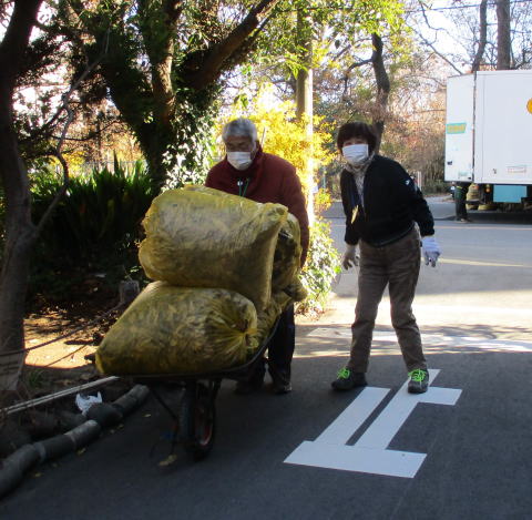 令和2年(2020年)12月20日(日) 年末恒例の落ち葉掃きです。63袋でした。市の「落ち葉銀行」に提供すると、後日、腐葉土が届きます。コロナ禍のなかでしたが、天気も良く、マスク着用をしながら新鮮な空気を堪能しました。19名が参加しました。また、前日の19日と翌日の21日には、市から派遣された業者が、トウネズミモチ全数、ニセアカシア数本、クワやチャノキを伐採しました。ニセアカシアは裁断してもらい、後日、我々の手で杭や腰掛にして配置します。更に12月26日には、業者が歩道にはみ出ていた高木の枝打ちをしました。