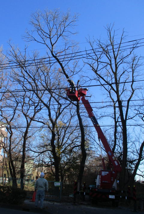 業者による「伐採作業」と「裁断したニセアカシア」 「高木の枝打ち」