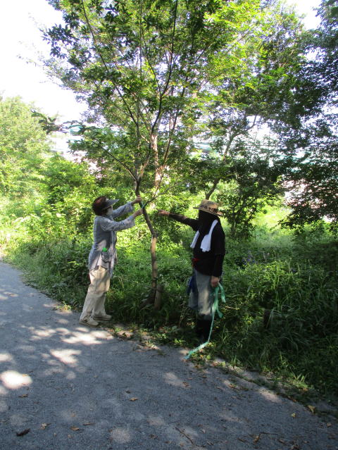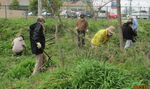 令和2年(2020年)7月12日(日)、有志5人が自主的に集まり、歩道にはみ出ていたイタドリを刈り取りました。また、2人が刈払機で3回目となる除草をし、歩道沿いの内側にはアサガオを植えました。