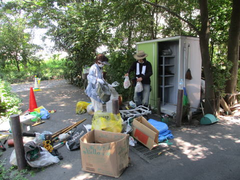 令和2年(2020年)8月20日(木)、8月末の行政による全域除草に備え、市の担当者2名と業者代表1名が確認に来ました。メンバー3名が立ち会い、そのあと、刈り取られないようにいくつかに目印を付けました。また倉庫内を点検し整理しました。