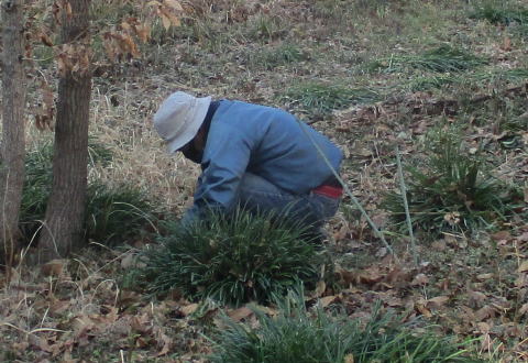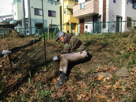 東側のササを取り除いています ここにはフクジュソウの若芽が数株が出ていました