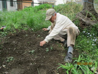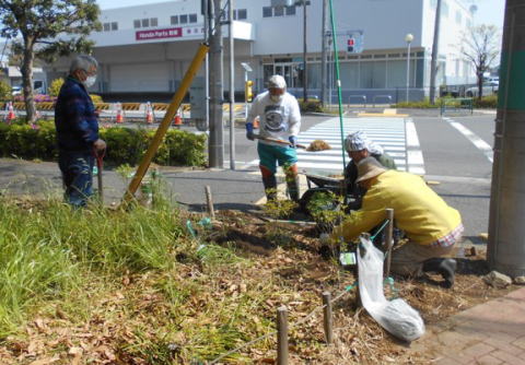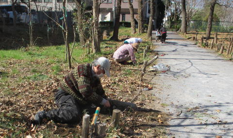 ▶4/29(木)祭日、自主的に5名が集まり東側の入り口に沿って、ドウダンツツジの苗木7本を植えました。