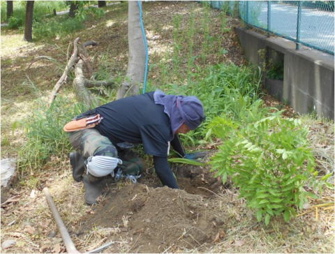 ▶5/5(火)祭日、緑地の北側に隣接する住宅から、3本の藤の苗木をいただき、東側の一角に植栽しました。